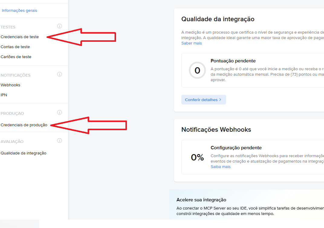 2.2.3.2. "Credenciais de teste": São destinada em fase de teste, não capturando pagamentos